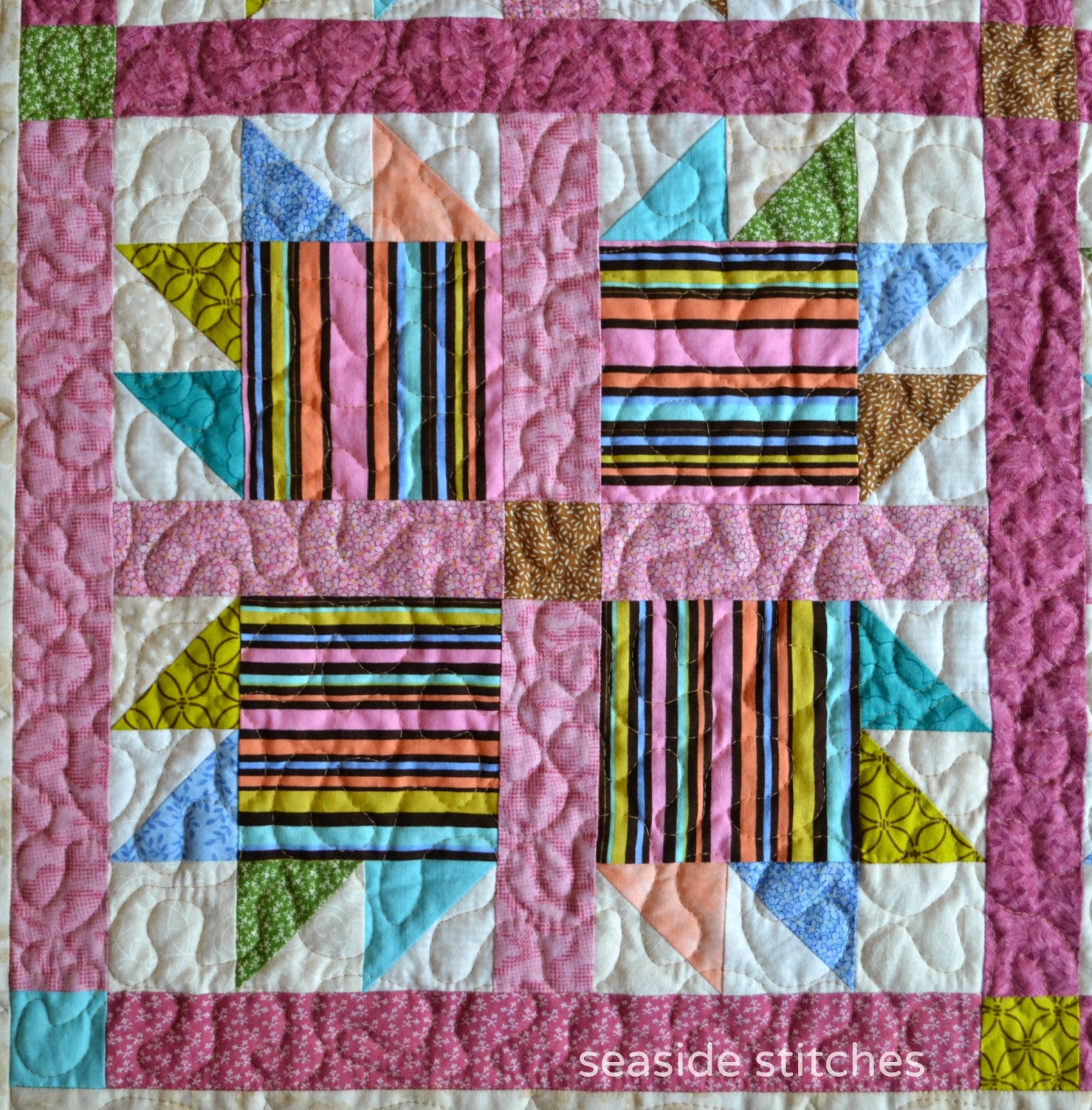 I did an overall stipple through the blocks in a medium tan thread. I'm having some trouble with Superior So Fine threads breaking or skipping stitches. This may be due in part to low humidity. Who knew?